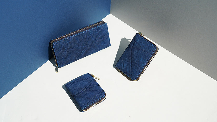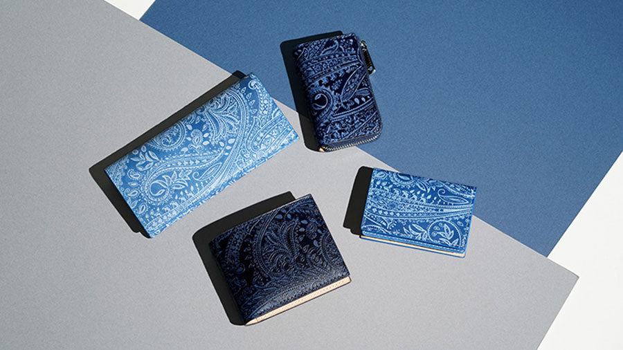 藍染めレザーにペイズリー柄の型押しを重ねた、唯一無二の存在感を放つシリーズ。型押し後に表面を丁寧に薄く削り出すことで、藍の深みと美しい濃淡がより際立ち、まるで一点物のような豊かな表情を楽しめます。他にはないデザインを求める方や、自分らしさを大切にする個性派の方にこそおすすめしたい、特別感あふれる逸品です。