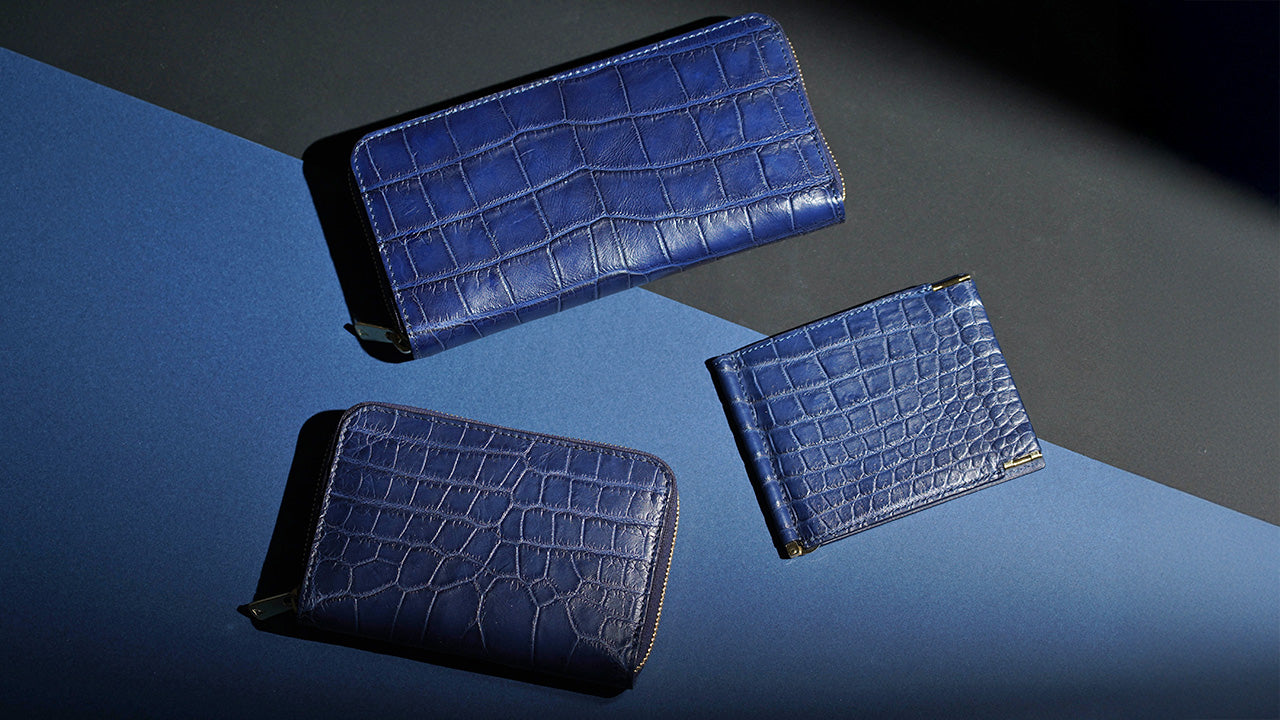 藍染めレザーの最高峰として仕上げられた、クロコダイル×藍染めの特別なシリーズ。牛革の約10倍の強度を誇るクロコダイルレザーですが、手に取ると驚くほど柔らかく、肌に馴染む上質な感触をお楽しみいただけます。クロコレザー特有の斑(ふ)の模様や形状は、ひとつひとつ異なり、世界に二つと同じものはありません。さらに藍染めならではの色の濃淡や透明感が加わることで、唯一無二の表情を持つ、まさに特別な逸品です。