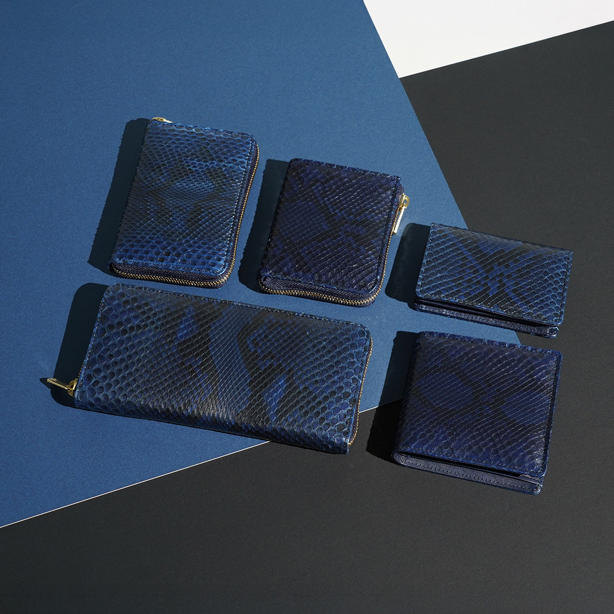 Snake leather finished using the Awa True Indigo Dyeing Method, an intangible cultural property designated by Tokushima Prefecture.