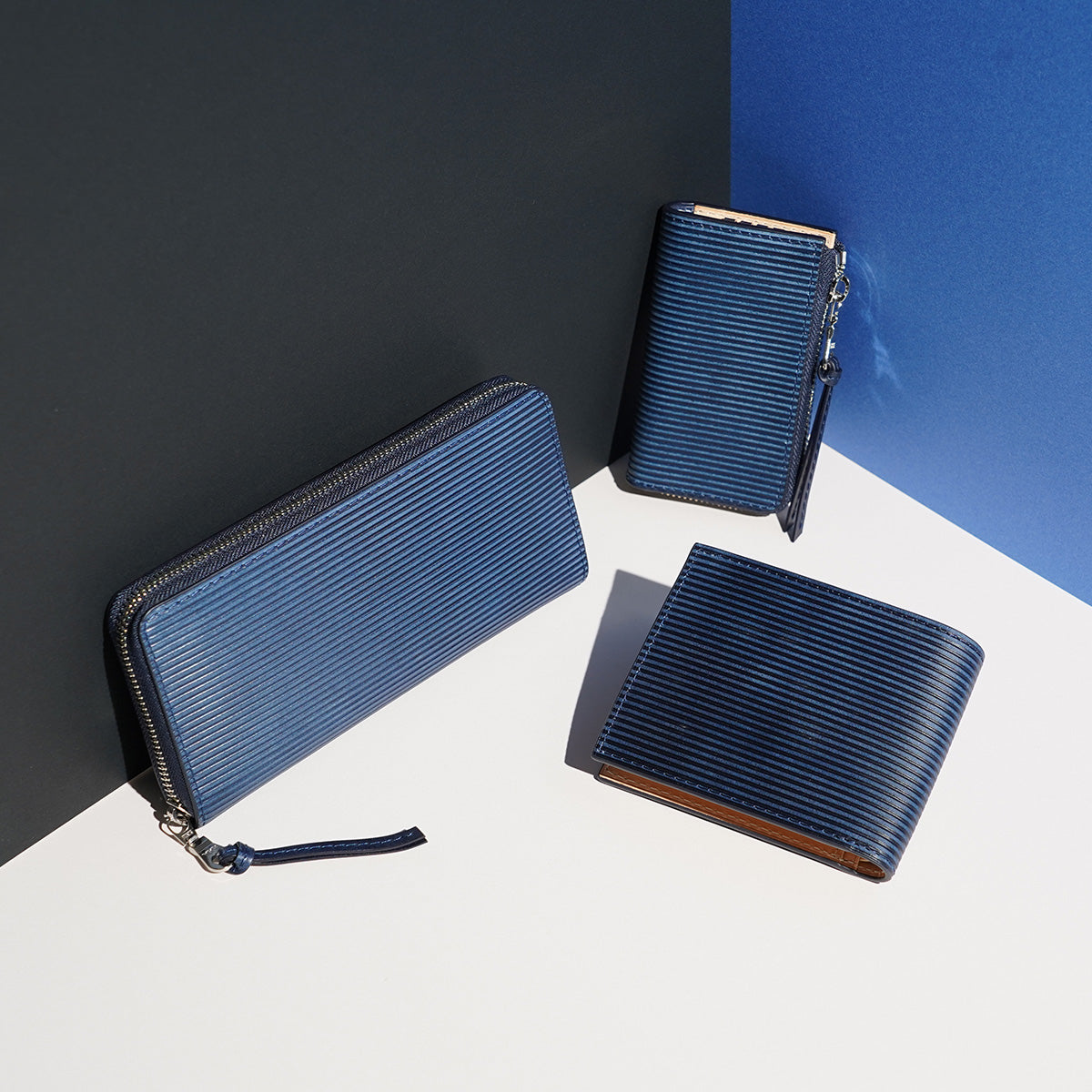 The sophisticated, straight striped design is embossed on high-quality indigo-dyed leather and then meticulously finished with sandpaper by skilled craftsmen.