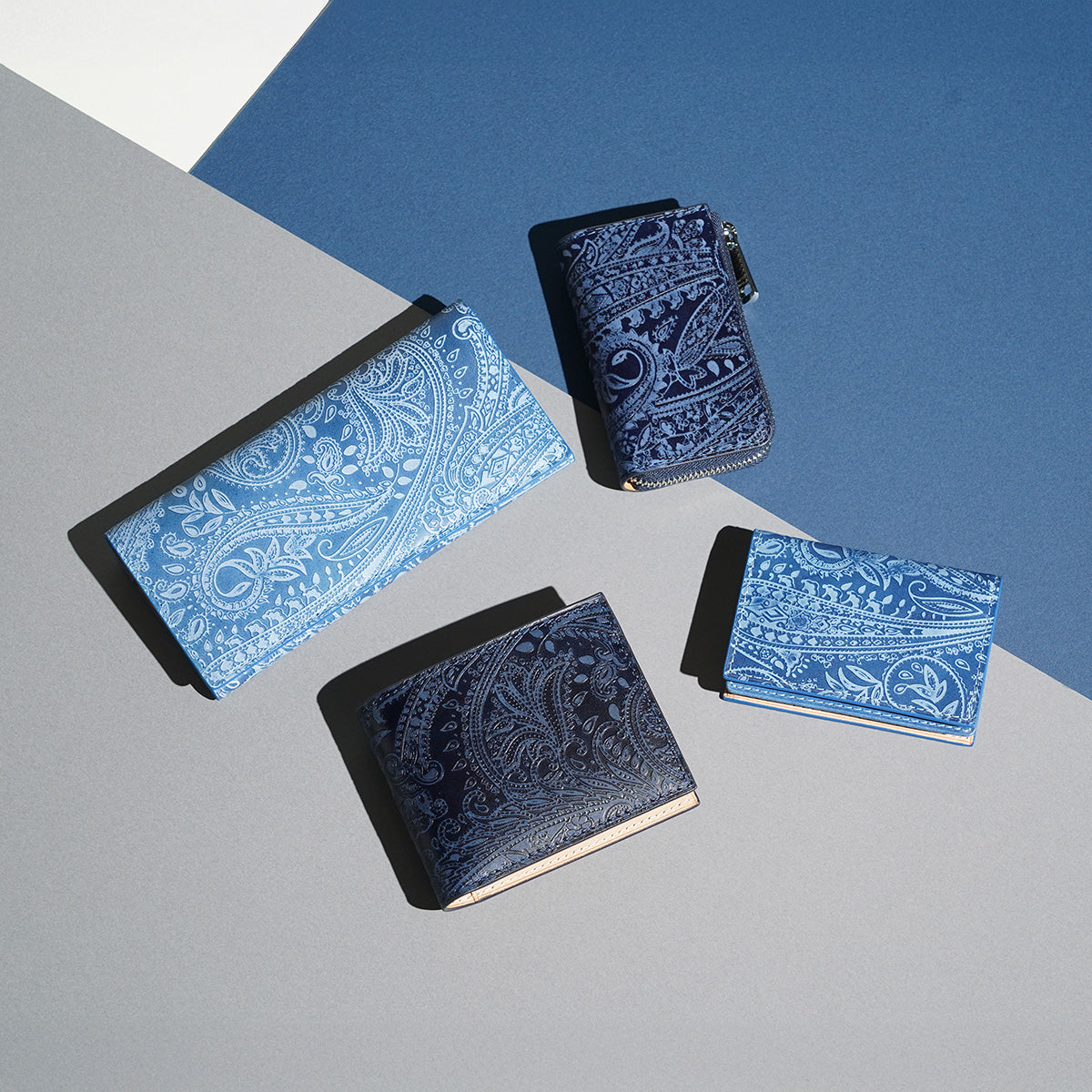 A delicately drawn paisley pattern is embossed onto high-quality indigo-dyed leather, and then carefully finished by skilled craftsmen using sandpaper.