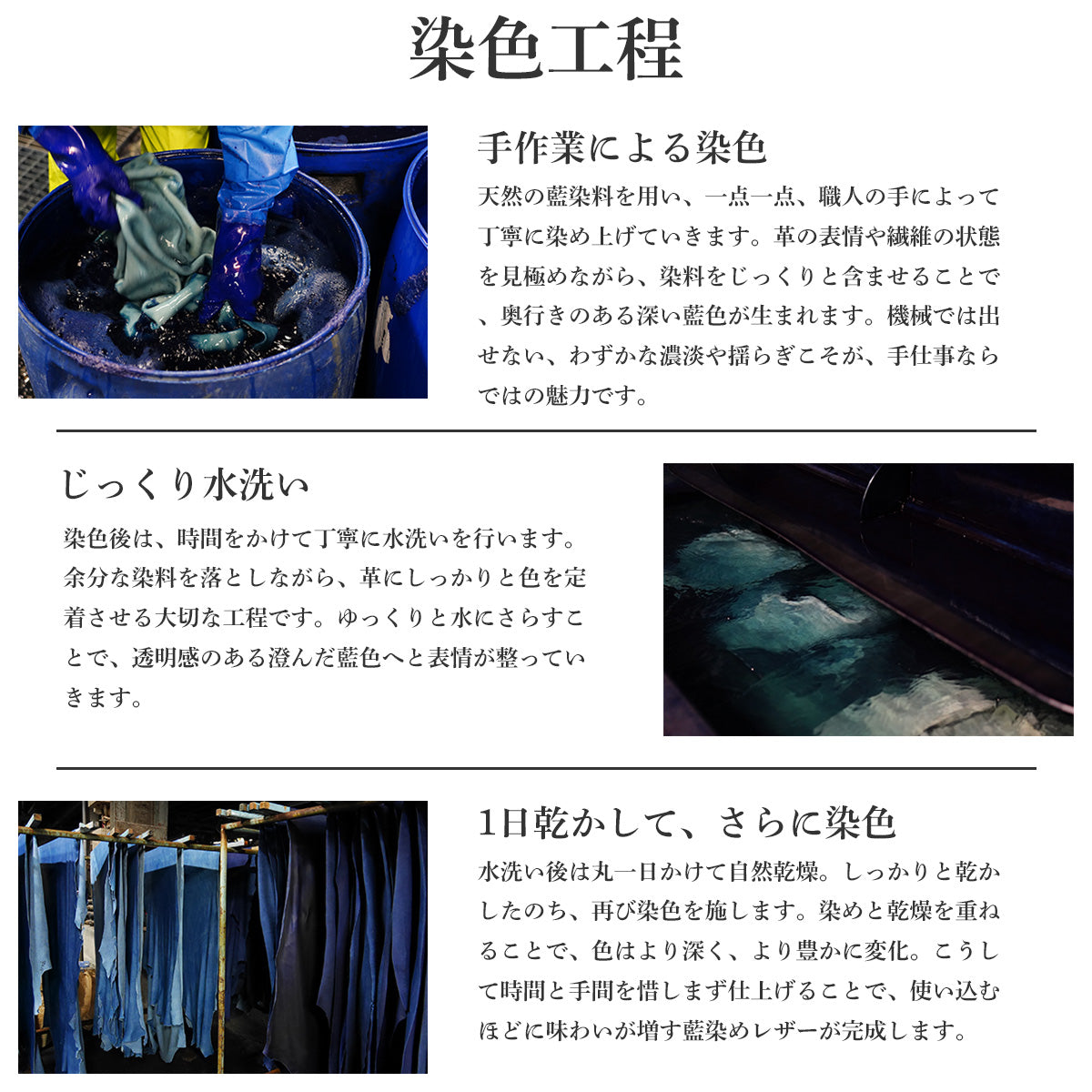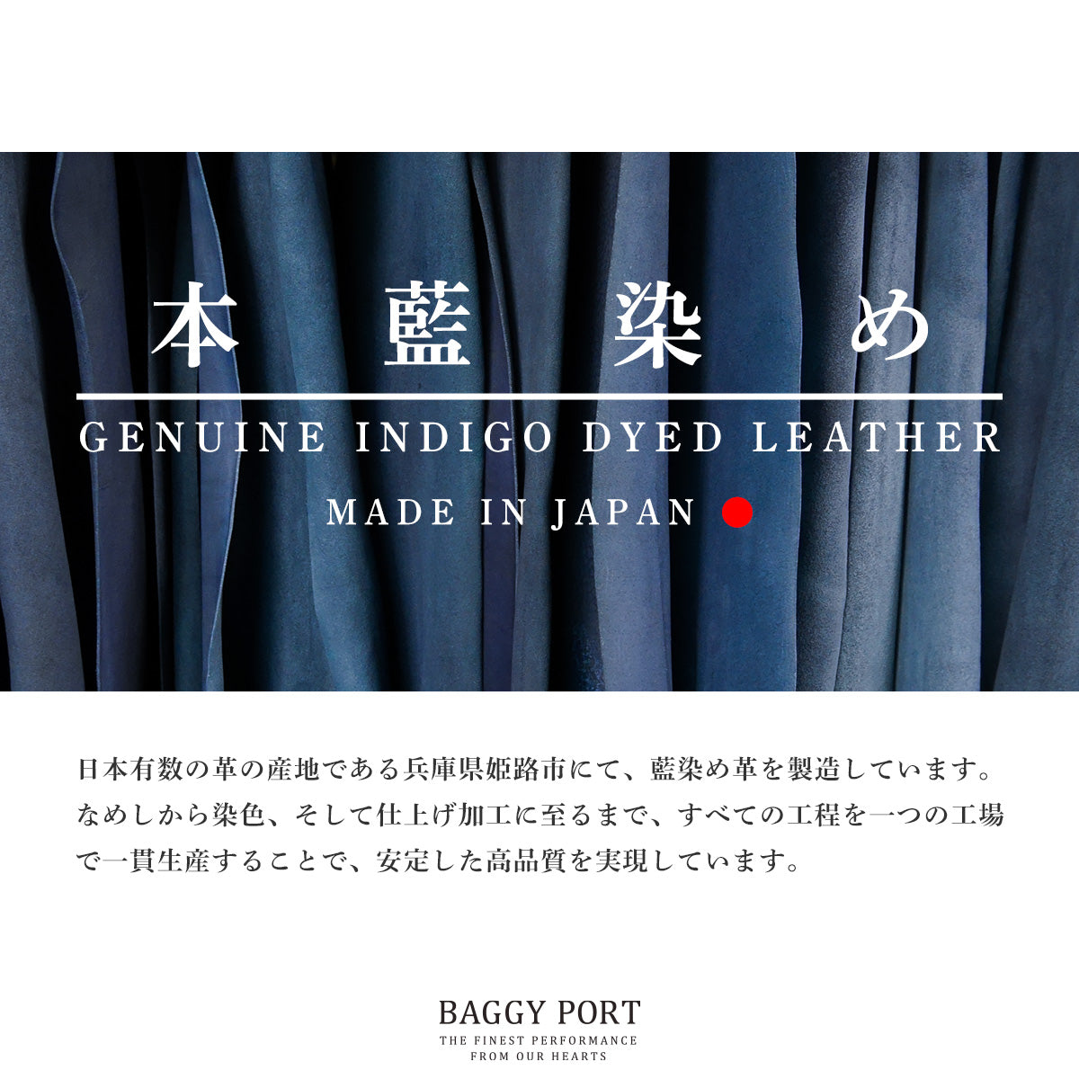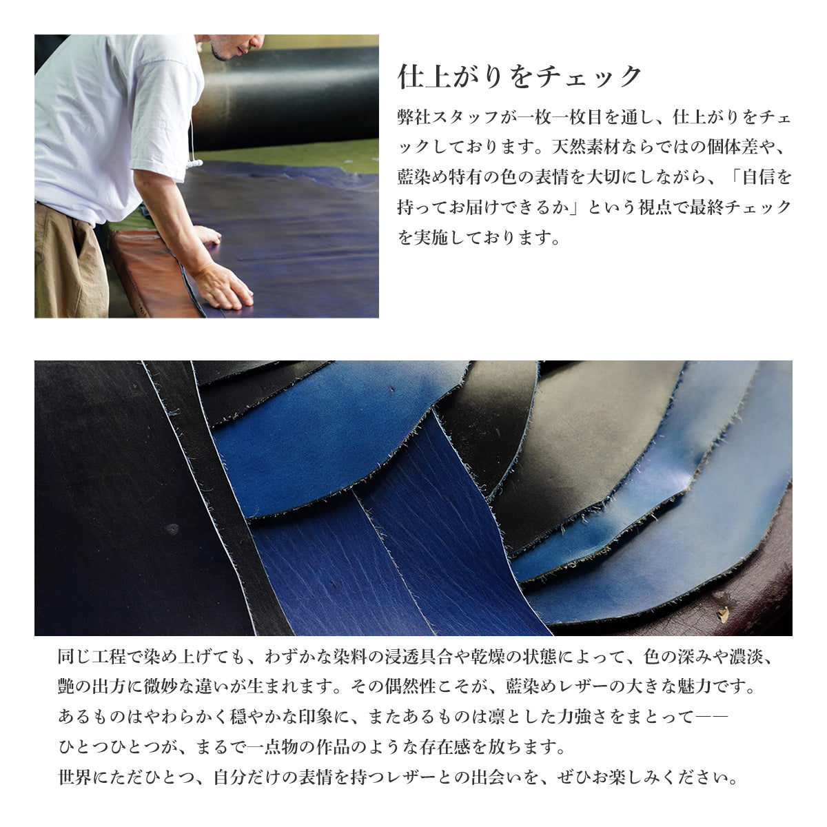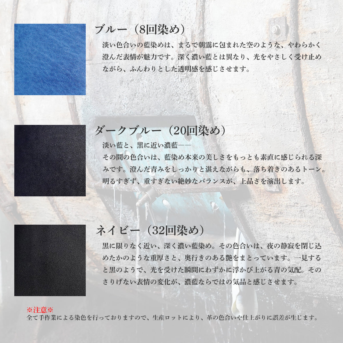 藍染皮革融合了皮革的魅力(隨著使用次數的增加,皮革的外觀會改變)和日本傳統的染色技術藍染。